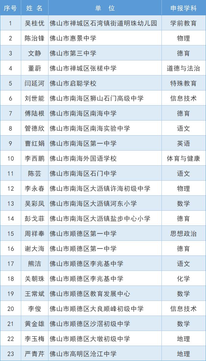 2022年度中小学正高级教师职称评审通过人员名单公示,佛山市共有23名教师上榜。公示时间从8月14日至21日止(不含公示当天,共5个工作日)。若对通过人员有异议,请电话或书面向省教育厅师资管理处或其所在单位或上级教育主管部门的人事职改部门或纪检、监察部门反映。>>详细阅读:佛山教育