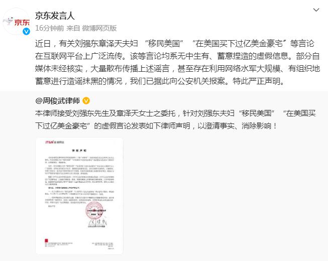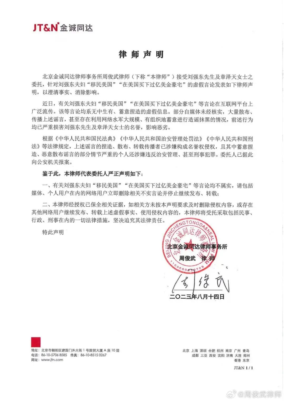 北京金诚同达律师事务所高级合伙人周俊武也发布微博称,受刘强东及章泽天委托,针对刘强东夫妇“移民美国”“在美国买下过亿美金豪宅”的虚假言论进行律师声明。
