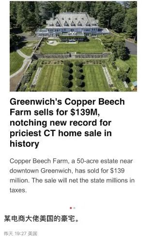 据爆料,这个豪宅建筑群住宅面积1.35万平方英尺,被称为“Copper Beech Farm”农场。前房主是桥水对冲基金的创始人Ray Dalio。还有华人网友声称,前几天在豪宅所在的格林威治小镇的星巴克看到章泽天了。