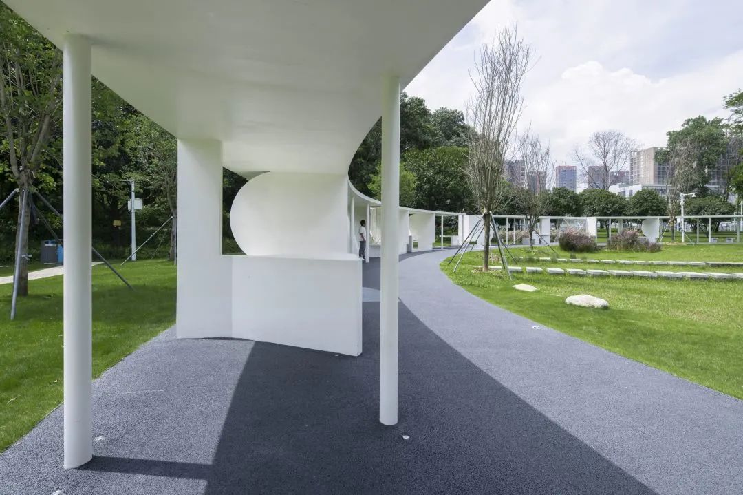 改造项目设计利用了旧园路蜿蜒流畅的内缘,依地势嫁接一条轻盈的、可生长的家具装置群组——“S 云廊”,“家具单元 + 盖顶 + 立柱”的空间组合结构,为公园创造一个灵活多变的休憩空间。当新的功能场地引入公园,可截断部分长廊腾挪空间,或有更多休憩遮蔽需求时,复制其中几处单元盖顶组合,形成或长或短的“备用件”,补充在主园路的其他位置。