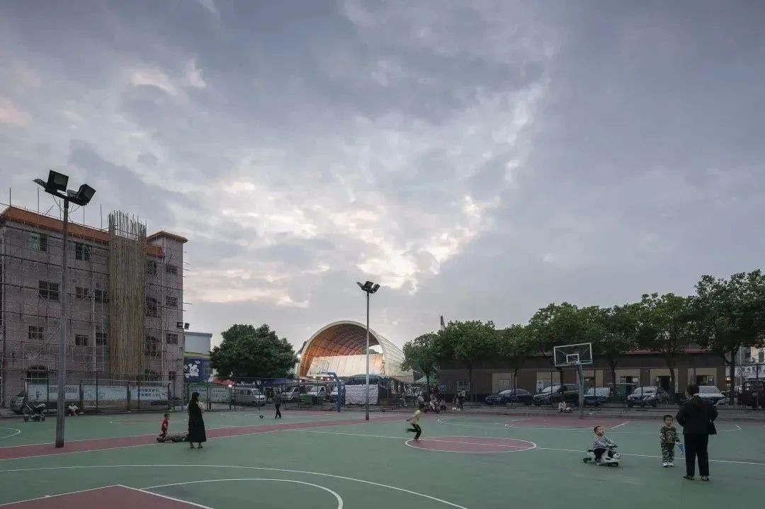 在项目建筑师靳远看来,对外部的塑造要比对内部的塑造更重要,因为外部可以直接和“模糊的周遭”相碰撞叠加。在前期对一个城郊小镇“新村子”的观察中,他决定设计一个具有主体性却又稍显意外的构筑物。同时这个构筑物也足够开放,用钢结构打造的棚子的顶部呈现拱形,底部摊贩、商品、市民的日常活动,自然、无序的内部空间昭然若揭。