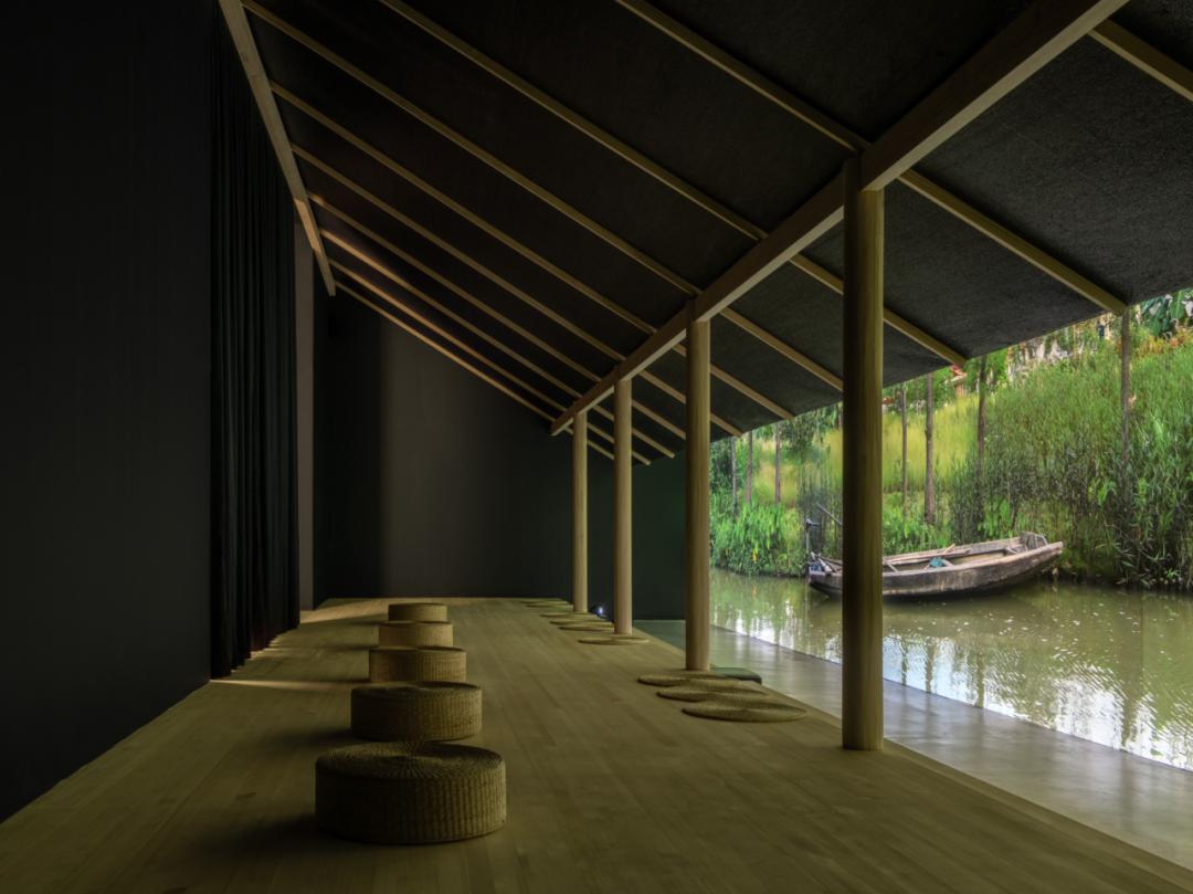 阴影是遮蔽,同样也是一种生活方式的呈现,它或许不是东方美学所崇尚的“禅悟”状态,但它在南方生活惬意、随性的节奏中,同样蕴含着万物的灵气。观众不仅可以在展览的序厅中通过文献资料的阅读清晰了解更广范围的“活性”的南方,走进第三展厅(C Hall),吴嗣铭的作品又为他们打造了一场沉浸式的视听体验:淅淅沥沥的雨声、阳光普照的道路和池塘、空旷的室外景观,摄影师拍摄记录下参展的十处建筑在不同天气状况中的场景。挑檐和立柱的放映室设计让观众仿佛置身于某个阴影自然与建筑相融合的场景之中,动态的视听呈现紧密契合了“活性建筑”的主题。