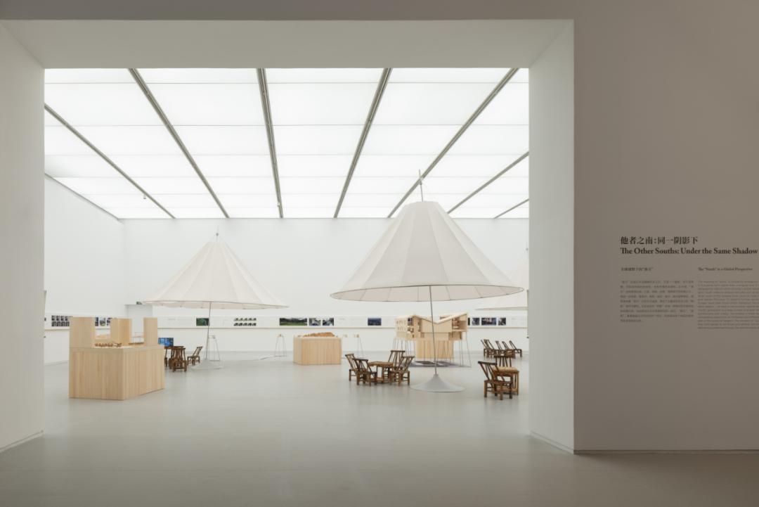 从城-镇-乡的路径出发,展览以一个广泛、公共的视角来观察、分析和演绎南方的阴影。A展厅上方均匀通透的面光映射在灰色的地面上,随着光线的变化,十个项目局部的剖面模型巧妙地呈现出其明暗变换;在人们持续感受南方充足的日光时,伞下的投影和声音装置则营造出被遮蔽后的阴凉,让这场阴影的重构,更意味着日常使用和身体感受的回归。