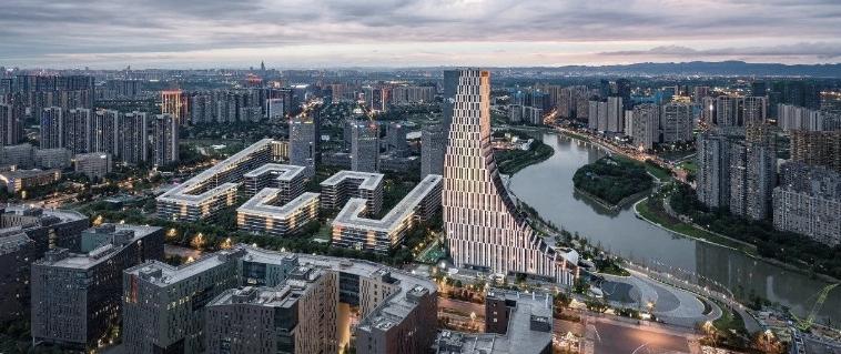 超塔建筑高度约150米,建筑功能为办公与裙楼开放式商业街区;特色文化建筑建筑高度约24米,建筑功能为艺术馆、图书馆、会议中心、展厅等公共性功能。经过两个多月的国际方案征集,由荷兰MVRDV建筑设计事务所以“绿脉”为主题设计的一组建筑中选,建成后将成为凸显成都公园城市、生态价值理念的全球性建筑标杆。