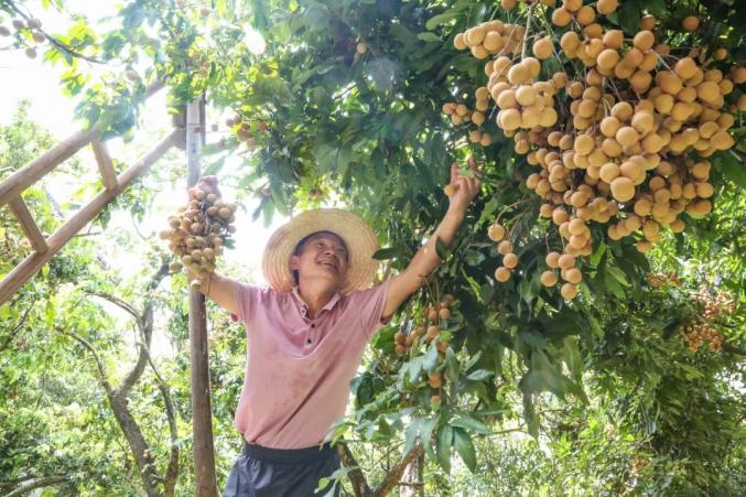 2023年8月7日,佛冈县汤塘镇四九村,龙眼喜获丰收,果农在采摘果实。清远日报签约摄影师 卢小丽 摄原标题:《清远“百千万工程” | 激活“潜力板” 绘就“和美图”》