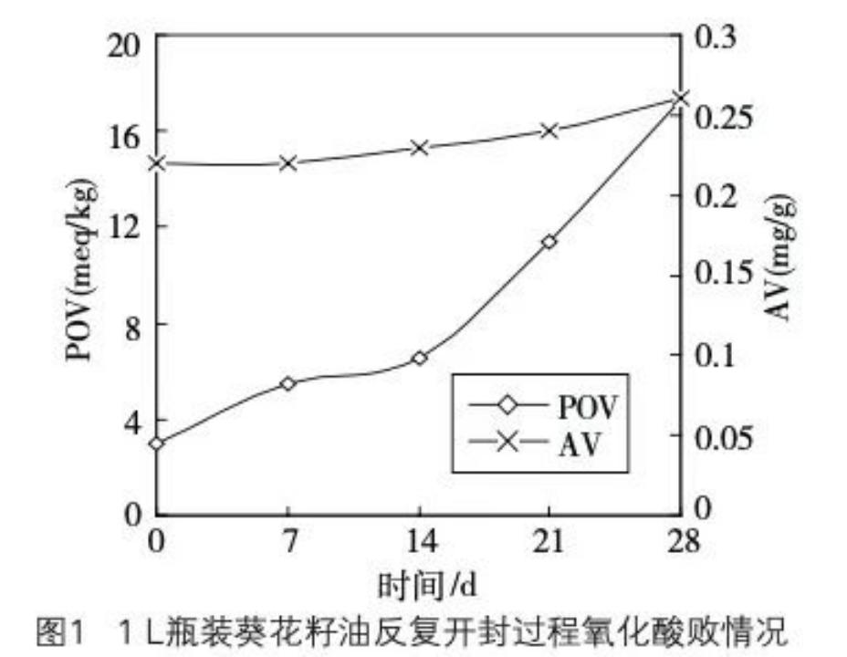 1 升装的葵花籽油,如果以每天打开一次、倒出 30 毫升的频率使用,28 天后过氧化值就会达到 18.08 毫克当量(meq)/千克。
