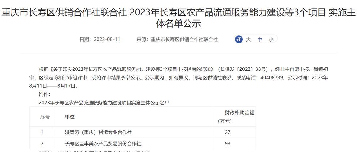 8月11日,长寿区供销社将评审结果予以了公示,其中,长寿区巨丰美农产品贸易股份合作社(下称巨丰美合作社)在农产品流通服务能力建设项目申报中,拟获得财政补助93万元。