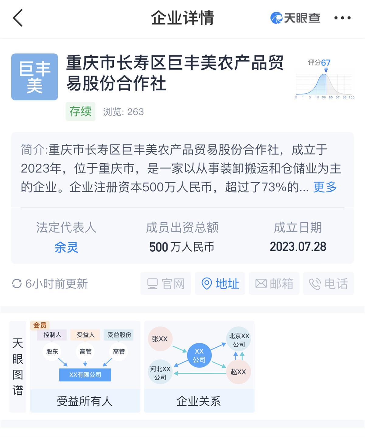 极目新闻记者查询天眼查显示,拟获得补助的长寿区巨丰美农产品贸易股份合作社是一家以从事装卸搬运和仓储业为主的企业,核准日期为2023年7月28日,企业类型为农民专业合作社,企业注册资本500万元人民币,注册地在重庆市。