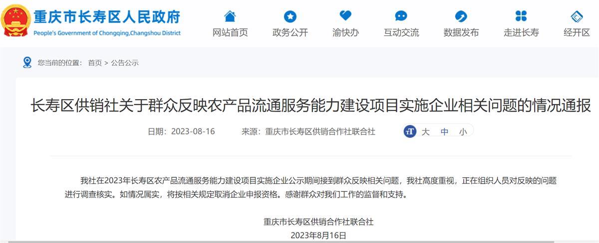 8月16日,重庆市长寿区供销合作社联合社在长寿区政府官网发布了《关于群众反映农产品流通服务能力建设项目实施企业相关问题的情况通报》。通报显示,接到群众反映相关问题,该社高度重视,正在组织人员对反映的问题进行调查核实。如情况属实,将按相关规定取消企业申报资格。