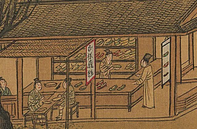 明 仇英《清明上河图》中的鞋店 辽宁省博物馆藏那前面的人就怜悯地说:“是这位大哥捡的,本来要和我分,现在看你可怜,就还给你,不过要给点辛苦费给他啊。”