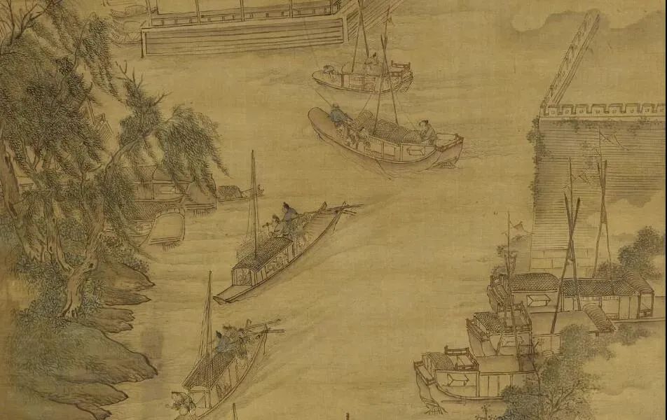 明 张宏《舟泊吴门图轴》局部 上海博物馆藏那监生很得意自己花便宜价钱换得的好金子,拿出来给大家看,大家纷纷称赞。天色变暗时,老道士也借过去细看,之后还给他。第二天,道士便下船走了。
