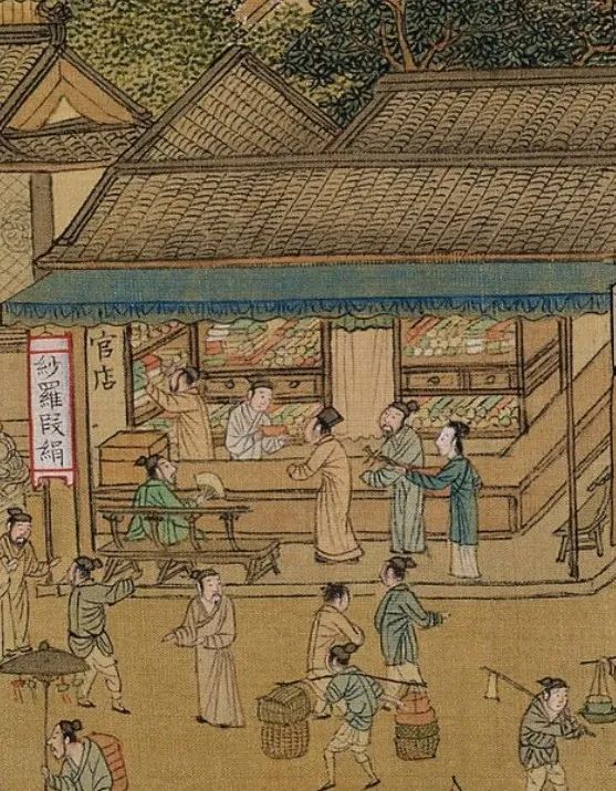 明 仇英 《清明上河图》中的纱罗缎绢店 辽宁省博物馆藏旁边有个僧人听到了,便决定第二天诈称方僧,骗来这件衣服。他来到江某家化缘,江某施舍了他两文钱,不过骗子并不满足。