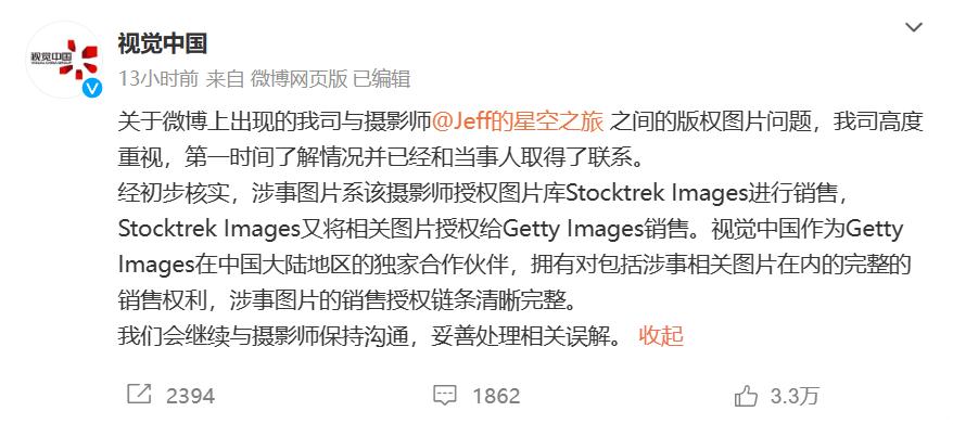 事后视觉中国在其官方微博回应称是误会,其图片来源是多次授权。8月16日,戴建峰驳斥了视觉中国的说法,并称:“我已与Stocktrek进行核实,Stocktrek明确告知我:视觉中国无权销售我的作品,也没有我作品的任何版权。Getty也无权将我的作品再次转授。”就本次事件,上游新闻记者进行了追踪和调查。