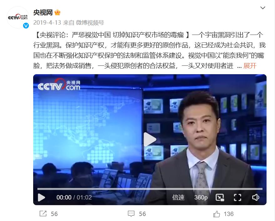 对于视觉中国“维权式营销”的恶劣模式,央视也曾进行了痛批,上游新闻记者查到:2019年4月13日,央视网就曾发表了评论《严惩视觉中国 切掉知识产权市场的毒瘤》,评论中央视评论员对视觉中国“把法务做成销售”的行为进行了批评,还将视觉中国的行为比作了版权交易的吸血毒瘤。
