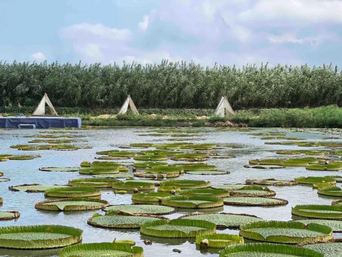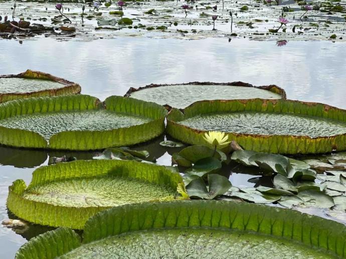 王莲为典型的热带植物,喜高温高湿,耐寒力极差,喜肥沃深厚的污泥。郭巨的海塘,为它们提供了极佳的生长环境。“王莲的观叶期近150天,一直延续到九月底。”江海燕介绍。