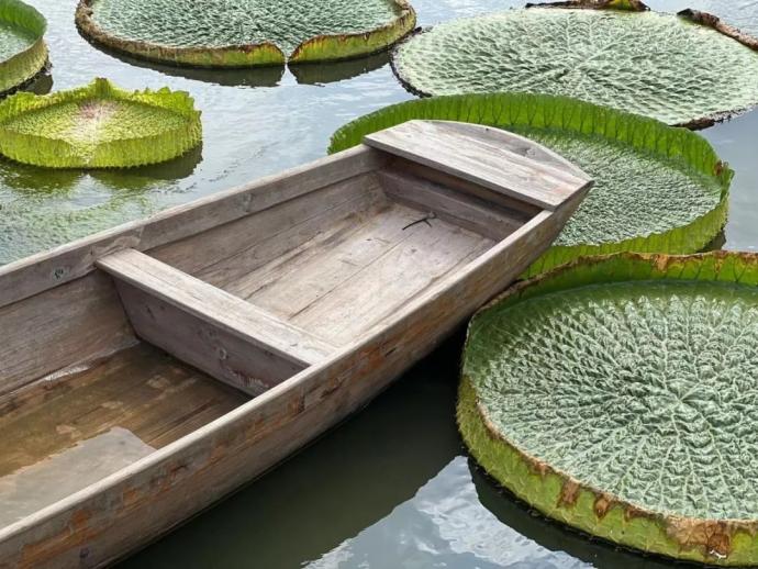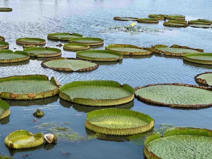 巨大的王莲叶片,如同一个个绿色的大玉盘,错落有致地铺满整个池塘。“现在正是王莲的最佳观赏期,它的叶片、筋脉已经长得非常粗壮,具有很大的浮力。”郭巨古镇莲园负责人江海燕告诉记者,目前王莲的叶片基本发育成熟。