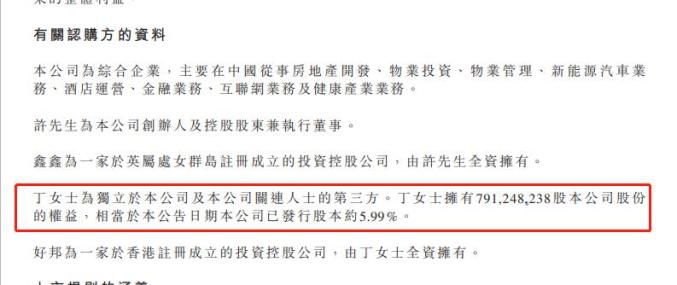 在此公告中,丁玉梅被定义为“独立于本公司及其关联人士的第三方”,而非和此前公告一样被列为许家印配偶。