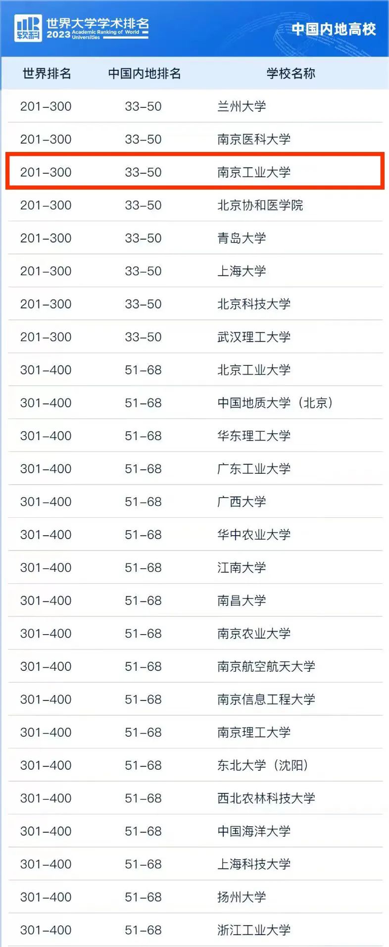2023年8月15日,全球领先的高等教育评价机构软科正式发布“2023软科世界大学学术排名”。南京工业大学位列第201-300名,首次进入世界300强。相比2022年世界第301-400名,南京工业大学的世界排名上升一个区间。