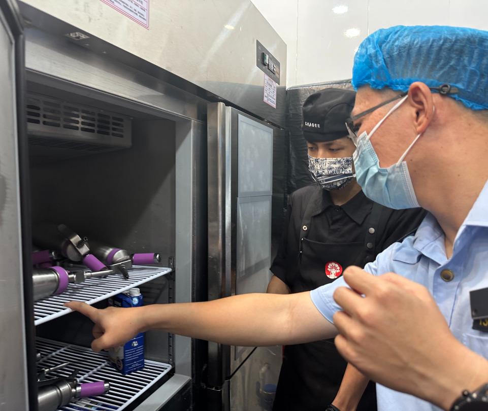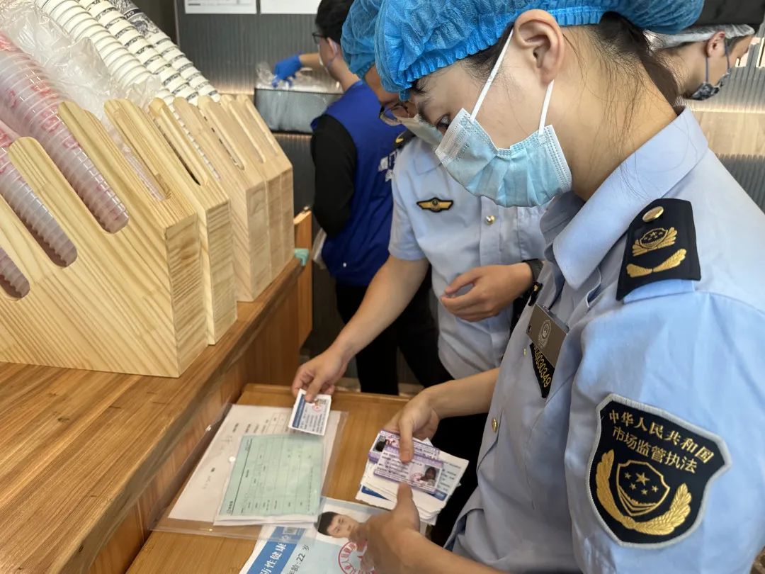 昨日上午,食安特勤队队员实地检查了该饮品店是否持证亮照、是否规范履行进货查验义务,人员健康管理、加工制作过程、设备清洗消毒、食品贮存等涉及食品安全环节是否符合规定,并随机抽取店员的健康证进行检查。