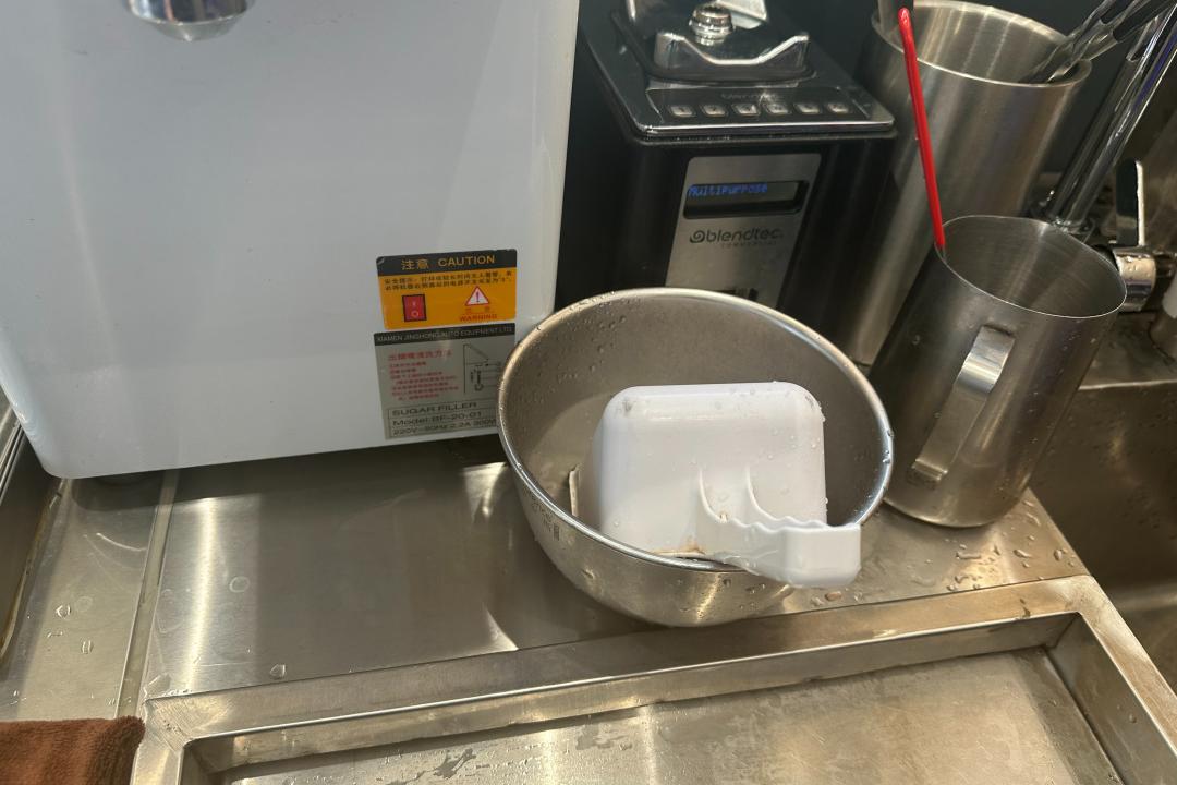 店员将冰铲放置在盛有消毒水的容器内,但消毒水未能完全浸没冰铲,无法起到消毒作用。