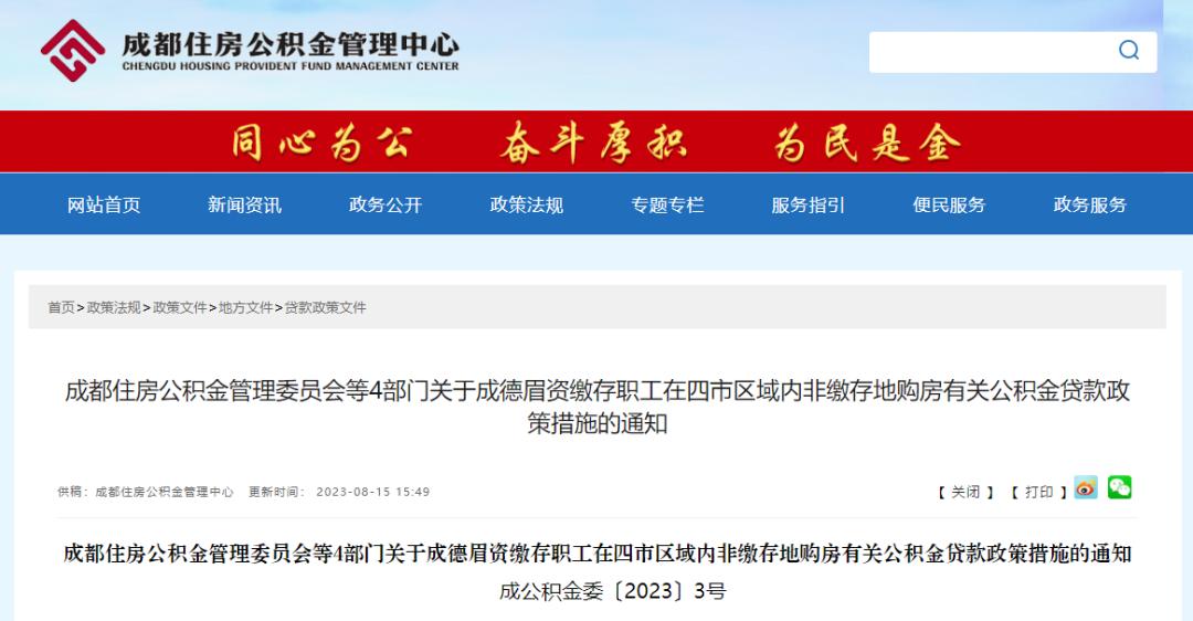 日前,成都住房公积金管理委员会等4部门下发了《关于成德眉资缴存职工在四市区域内非缴存地购房有关公积金贷款政策措施的通知》(以下简称《通知》)。