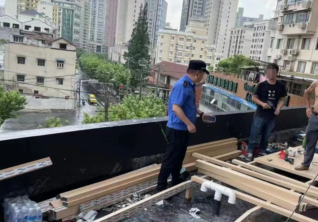 接到群众投诉后,中队执法人员立即赶到现场查看,发现大楼南侧与北侧的4楼公共平台上均安装了木制地板,违法行为属实,且在户外搭建木制地板存在一定的消防安全隐患。据了解,该平台为3楼屋顶,应属于物业共用部分,并非业主个人所有,违法当事人未经相关部门审批,属于擅自改建、占用物业共用部分,违反了《上海市住宅物业管理规定》相关规定。
