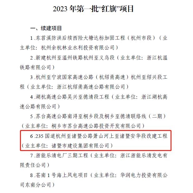 近日,《省扩大有效投资重点建设领导小组办公室关于2023年第一批“红旗”项目评定情况的通报》公布,全省共14个项目上榜,我市的235国道杭州至诸暨公路萧山河上至诸暨安华段改建工程成功入选,是绍兴市唯一入选项目。