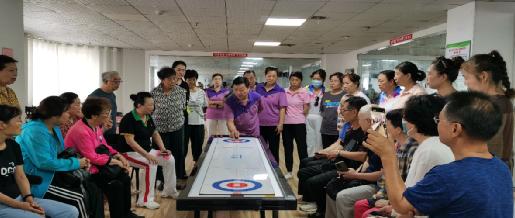 在永安街道煤建北村社区新时代文明实践站,“江苏省文明家庭”获得者张侠夫妇带领社区居民开展以“全民健身 绘就幸福生活”为主题的桌上冰壶趣味竞赛活动。