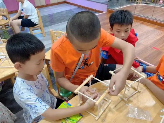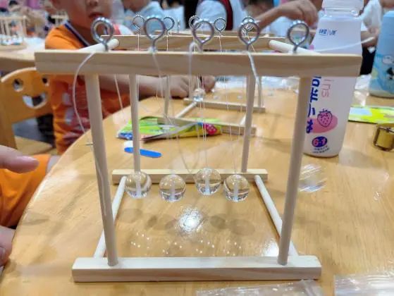 牛顿摆是5个质量相同的摆球由吊绳固定,彼此紧密排列的桌面演示装置。在小朋友们学习了能量守恒定律和动量守恒定律后,志愿者老师和小朋友们一起动手组装牛顿摆,从观察到的现象当中验证能量守恒定律和动量守恒定律。