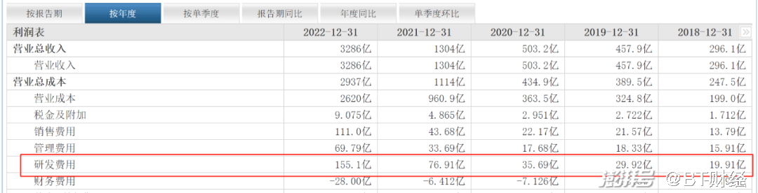 财报数据显示,今年上半年宁德时代的研发费用为98.5亿元,同比去年同期的57.68亿元猛增了70.77%。2022年宁德时代研发费用为155.1亿元,同比2021年的76.91亿元增长了101.66%。近5年中的前4年宁德时代的研发费用分别为19.91亿元、29.92亿元、35.69亿元和76.91亿元,同比增幅分别为22.01%、50.28%、19.29%和115.48%。研发费用增幅最低的2020年是19.29%,但依然有近20%的增幅。