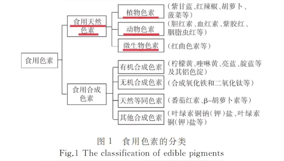 食用天然色素食用天然色素包括了植物色素、动物色素和微生物色素。根据GB 2760-2014食品安全国家标准《食品添加剂使用标准》规定,我国可添加于食品中的色素共有67种,其中天然色素有56种。