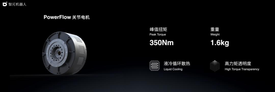 智元自研的PowerFlow使用了准直驱关节方案,实现了低齿槽转矩设计,搭配10速比以内的高力矩透明度行星减速器、共轭同轴双编码器、一体液冷循环散热系统,以及自研的矢量控制驱动器,峰值扭矩超过350Nm,而重量仅为1.6kg。