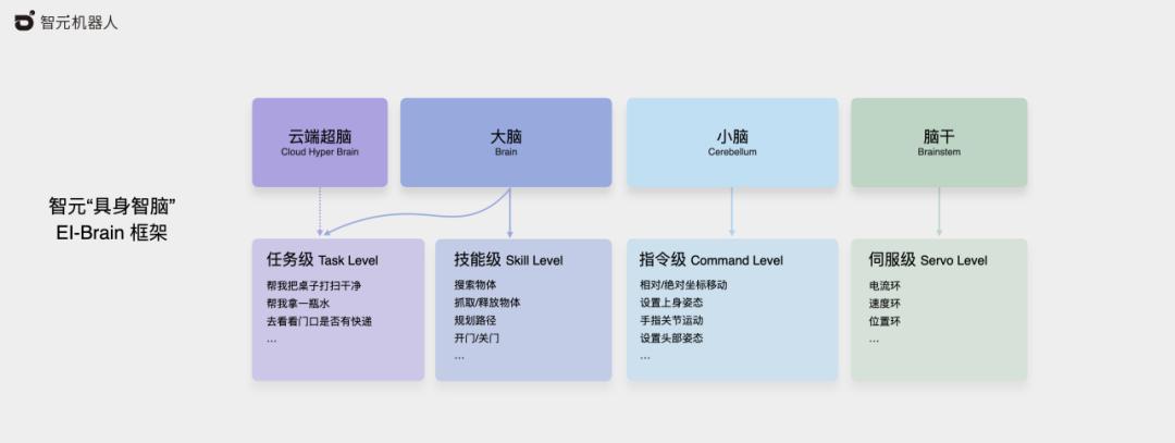 智元的具身智脑EI-Brain架构中,把机器人的思维系统分为云端的超脑、端侧的大脑、小脑,以及脑干几层,分别对应机器人任务级、技能级、指令级以及伺服级的能力。
