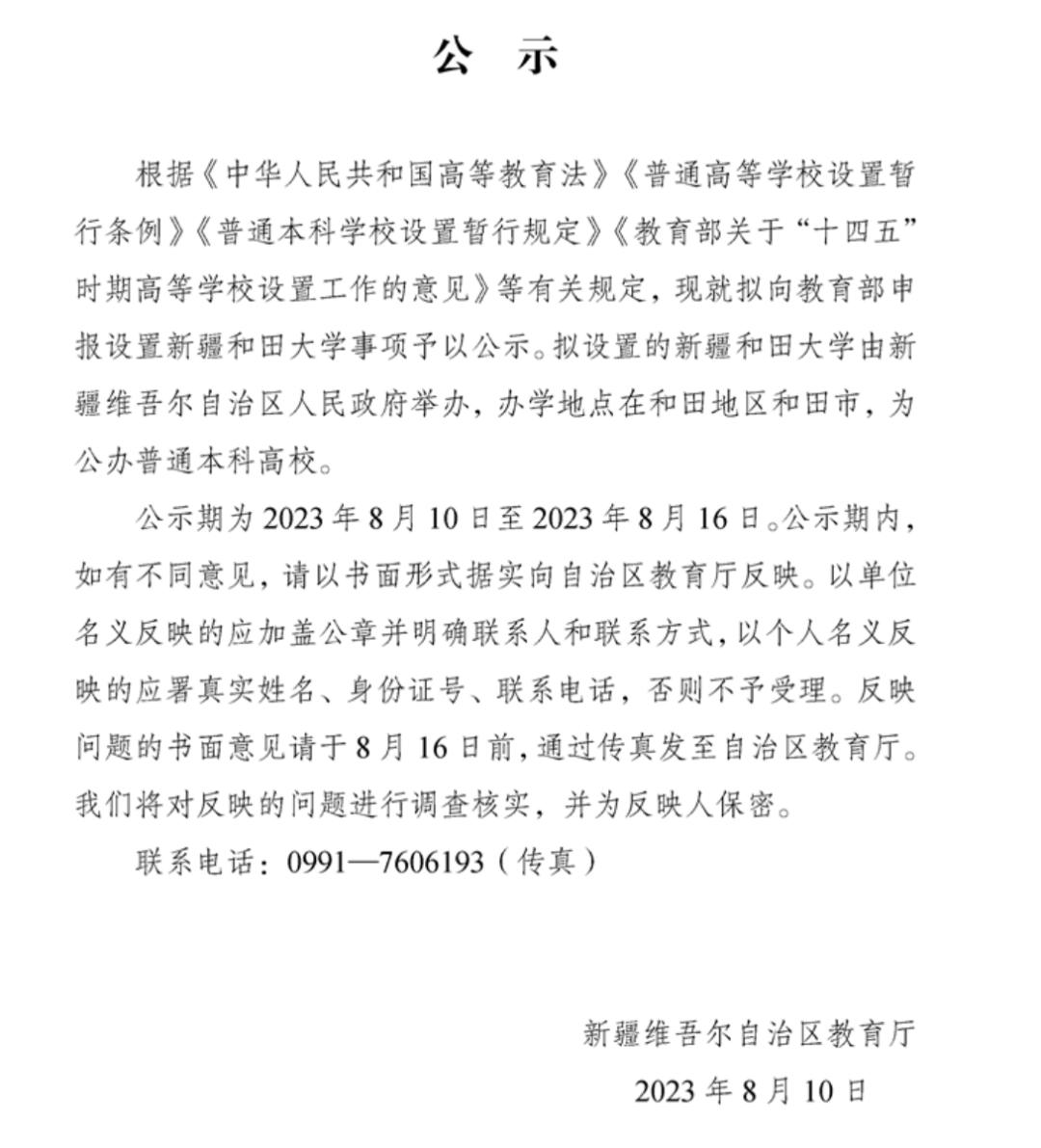 8月10日,新疆维吾尔自治区教育厅网站发布公示,拟向教育部申报设置新疆和田大学事项。公示显示,拟设置的新疆和田大学由新疆维吾尔自治区人民政府举办,办学地点在和田地区和田市,为公办普通本科高校。