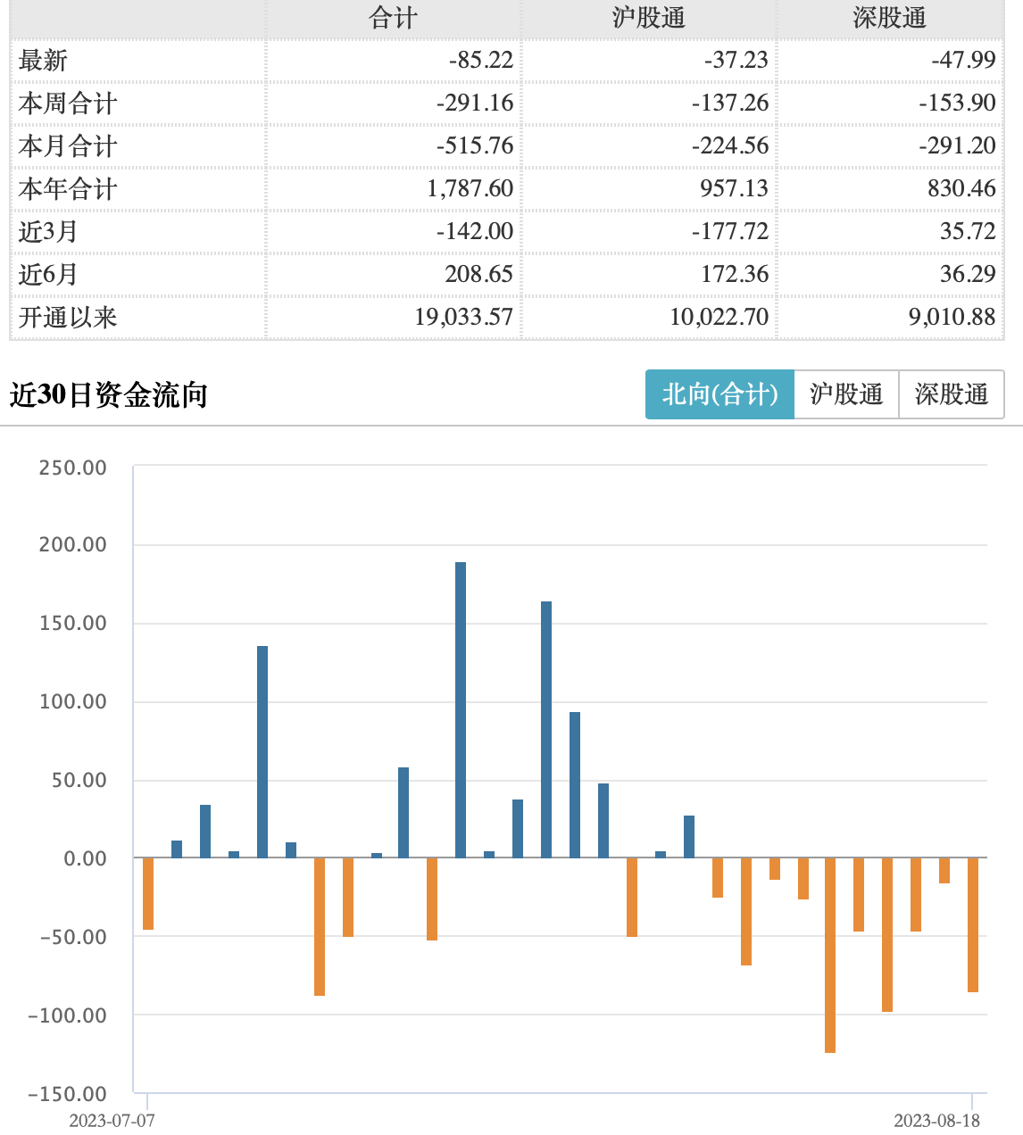 8月18日,A股三大股指震荡下行,收跌超1%。北向资金全天净卖出85.22亿元,其中沪股通净卖出37.23亿元,深股通净卖出47.99亿元。
