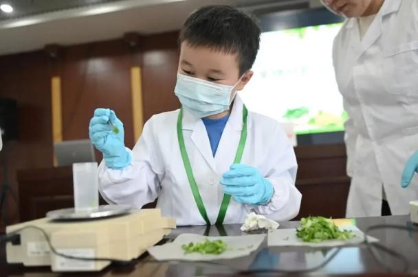 随后,小体验官们来到了检测室进行蔬菜农残检测。孩子们纷纷穿上“白大褂”,戴上“橡胶手套”,在工作人员的示范和指导下认真严谨地完成每一个实验步骤。“天啊,我的检测结果居然是阳性!”有的小体验官看到检测试纸上的“两条杠”后,惊呼道。