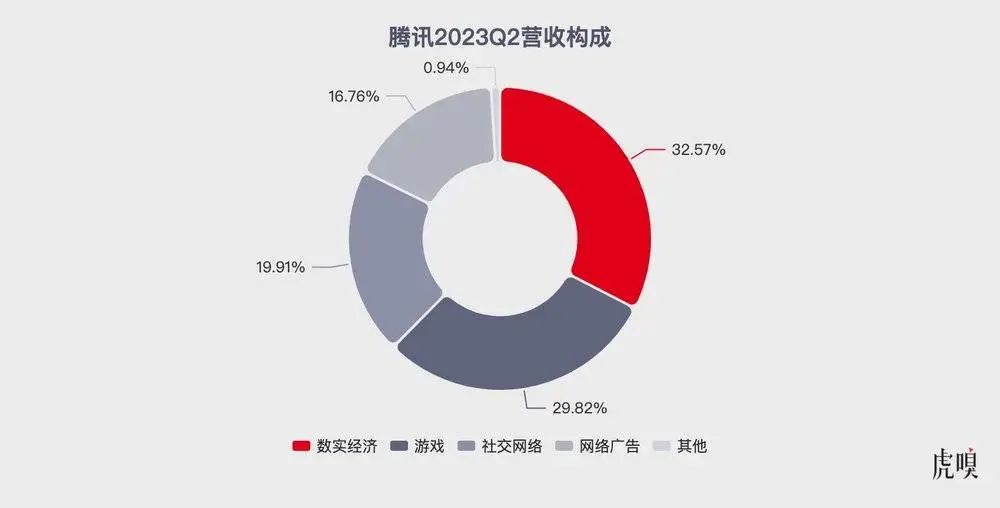 缓缓铺开腾讯 2023Q2 财报,数实经济( 486 亿元)、游戏( 445 亿元)、社交网络( 297 亿元)、网络广告( 250 亿元)、其他(14 亿元)五大核心业务共同为这个庞大的商业体泵血。