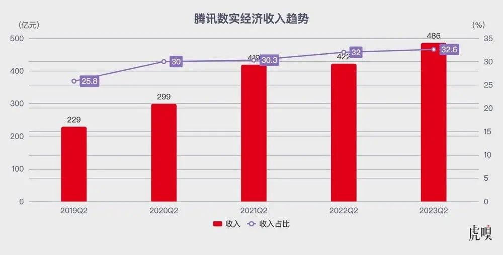 具体而言,扛起大梁的数实经济收入同比增长 15% 至 486.4 亿元,成为该季收入贡献最大板块——主要受益于疫情后线下经济恢复,线下线上商业支付活动骤增,以及视频号直播带货交易产生的收入、云服务的轻微增长。值得一提的是,数实经济已连续九个季度营收占比超过 30%;尤其企业服务方面,腾讯云行业大模型能力在腾讯企点、腾讯会议、腾讯云 AI 代码助手等多款 SaaS 产品中率先应用——等于说,腾讯调整生长路径,将重心移向数实经济已初显成效。