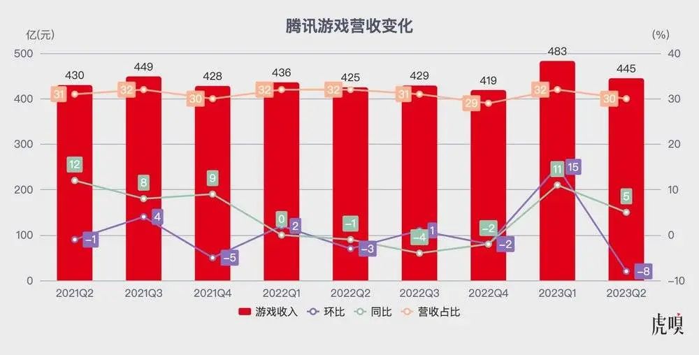 然而,打脸来得猝不及防—— 2023Q2 游戏业务收入 445 亿元,同比增长 5%,环比下降 8%。明显低于行业复苏增速。