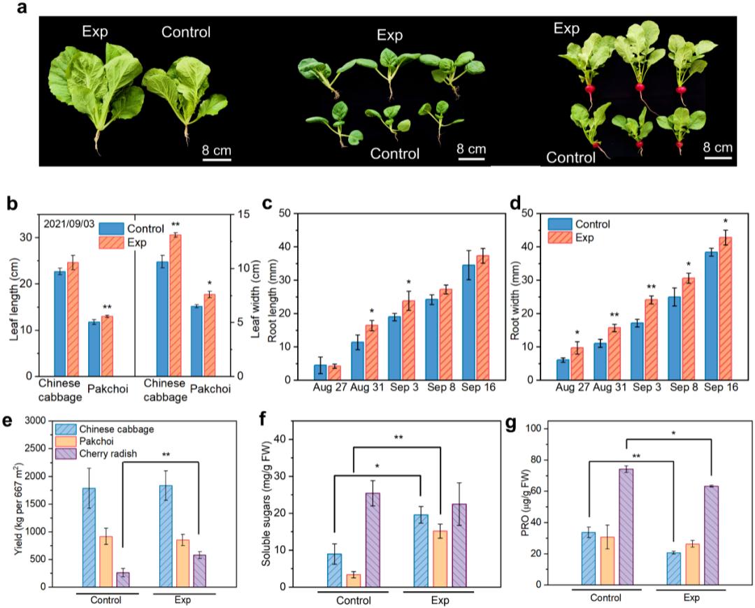 图3 T-RC薄膜的增产提质效果。温度是影响植物发育的最重要的环境因素。由于T-RC薄膜提供了更合适的温度,三种作物在试验温室中的生长速率显著高于对照温室(图3a-d)。樱桃萝卜由于其稀疏的地上部分和较宽的地下部分,比其他两种作物对温度变化更敏感。在整个繁殖周期中,试验温室中樱桃萝卜的根长和根宽都高于对照温室,根宽差异在整个生育周期中都很显著。在生长的前中期,杭白菜和奶白菜的最大生长差异分别可达23.4%±3.4%和17.3%±1.9%。生长指标的变化表明,T-RC膜可以显著促进三种指标作物的生长,并将生长周期缩短近一周。试验温室中的樱桃萝卜显著重于对照温室,无论是地上还是地下。营养器官和当量产量的差异分别高达76.2%±2.8%和120.1%±5.9%(图3e)。