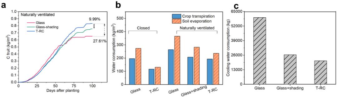 与玻璃温室和遮光玻璃温室相比,使用T-RC膜可分别增产27.61%和9.99%(图4a)。在炎热的气候条件下,即使使用了外部遮阴技术,室内温度仍然超过了大多数作物的适宜温度范围(图4b)。大多数商业温室常见的补充冷却方法是湿帘-风机系统,该系统基于将显热转化为蒸发水的潜热。然而,湿帘-风机系统的运行将导致大量的水损失,并进一步加重农业部门的缺水负担。相比之下,T-RC膜覆盖的温室在整个栽培期消耗了21010kg的冷却水,用T-RC膜代替常规覆盖材料后,温室冷却耗水量最大减少率可达64.8%(图4c)。