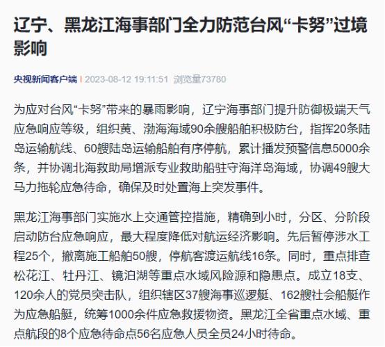辽宁、黑龙江海事部门全力防范台风“卡努”过境影响