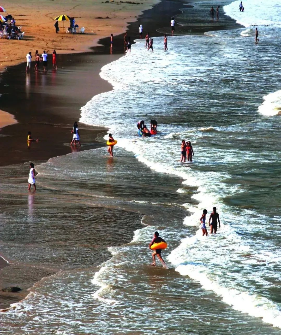 挺拔葱茏的棕榈树,碧蓝的天空,翻滚的浪花,柔软的沙滩,高大的绿植,曲折的步道,海鸟在空中掠过。戴上墨镜,享受此刻的日光浴……龙湾沙滩