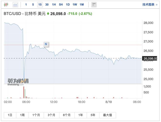 据券商中国报道,8月18日凌晨,大型加密货币突然集体暴跌,比特币短线一度跌超3000美元,日内最大跌幅超13%,一度跌穿2.5万美元关口,截至发稿,比特币最新价格回升至26086美元,较7月高点累计跌幅超18%;另外,以太坊日内最大跌幅超13%,一度下破1600美元关口,现报1662美元。
