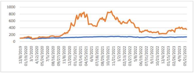 图为:2019年12月-2023年6月比特币和标准普尔500走势图,数据来源:英为财情说明:橙线和蓝线表示比特币价格指数和标准普尔500指数(2019年12月8日价格=100)