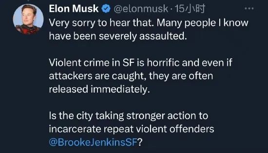 Bob Lee遇害的消息在币圈及科技界引起极大关注。马斯克发文称,“听到这个消息我很难过。我认识的很多人都遭到了严重侵犯”。他补充说,“旧金山的暴力犯罪是可怕的,即使袭击者被捕,他们通常也会被立即释放。”他同时质问旧金山市是否采取更强有力的措施来预防暴力犯罪。
