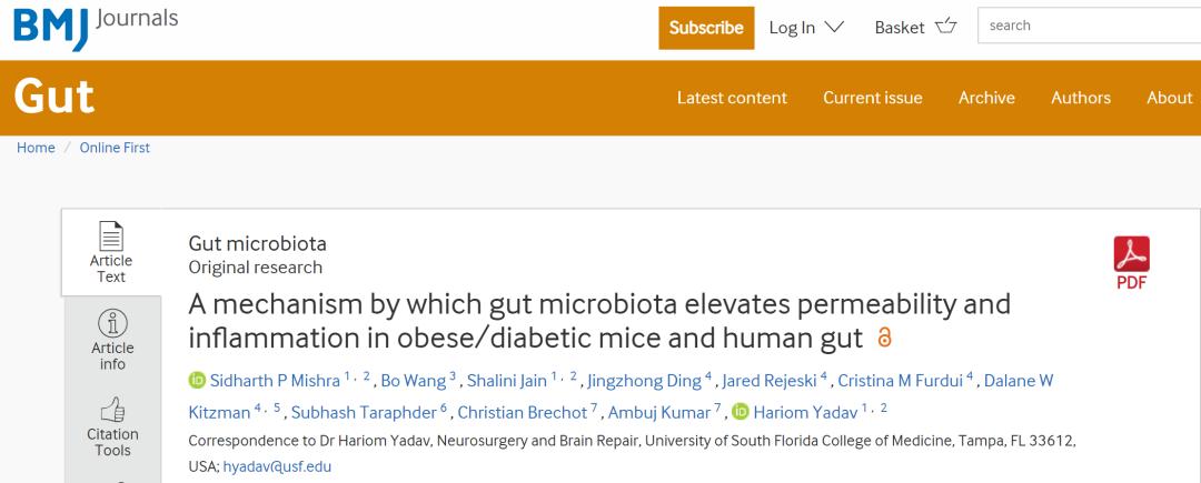 由佛罗里达理工学院(Florida Institute of Technology,FIT)化学工程助理教授 Bo Wang 和南佛罗里达大学(University of South Florida,USF)的研究人员共同撰写的一篇论文研究了肠道微生物的作用。论文题目“肠道菌群增加肥胖/糖尿病小鼠和人类肠道通透性和炎症的一种机制” (A mechanism by which gut microbiota elevates permeability and inflammation in obese/diabetic mice and human gut),这篇论文发表在英国胃肠病学会(British Society of Gastroenterology,BSG)的官方期刊《肠道》(Gut)春季版杂志上。