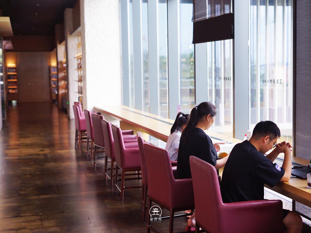 找个喜欢的位置轻巧落座,也许是窗边,也许是台阶上。阅读区的联排玻璃窗外,绿树层叠掩映,仿佛置身天然氧吧,还依稀可见远处风景,静读一本书籍,一边享受静谧的生活,一边品味诗书的墨香。