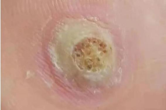 跖疣发生在足底的寻常疣,初起为细小发亮的丘疹,逐渐增大表面角化,边界清楚周围有稍高增厚的角质环。将表面角质削去,可见角质软芯。