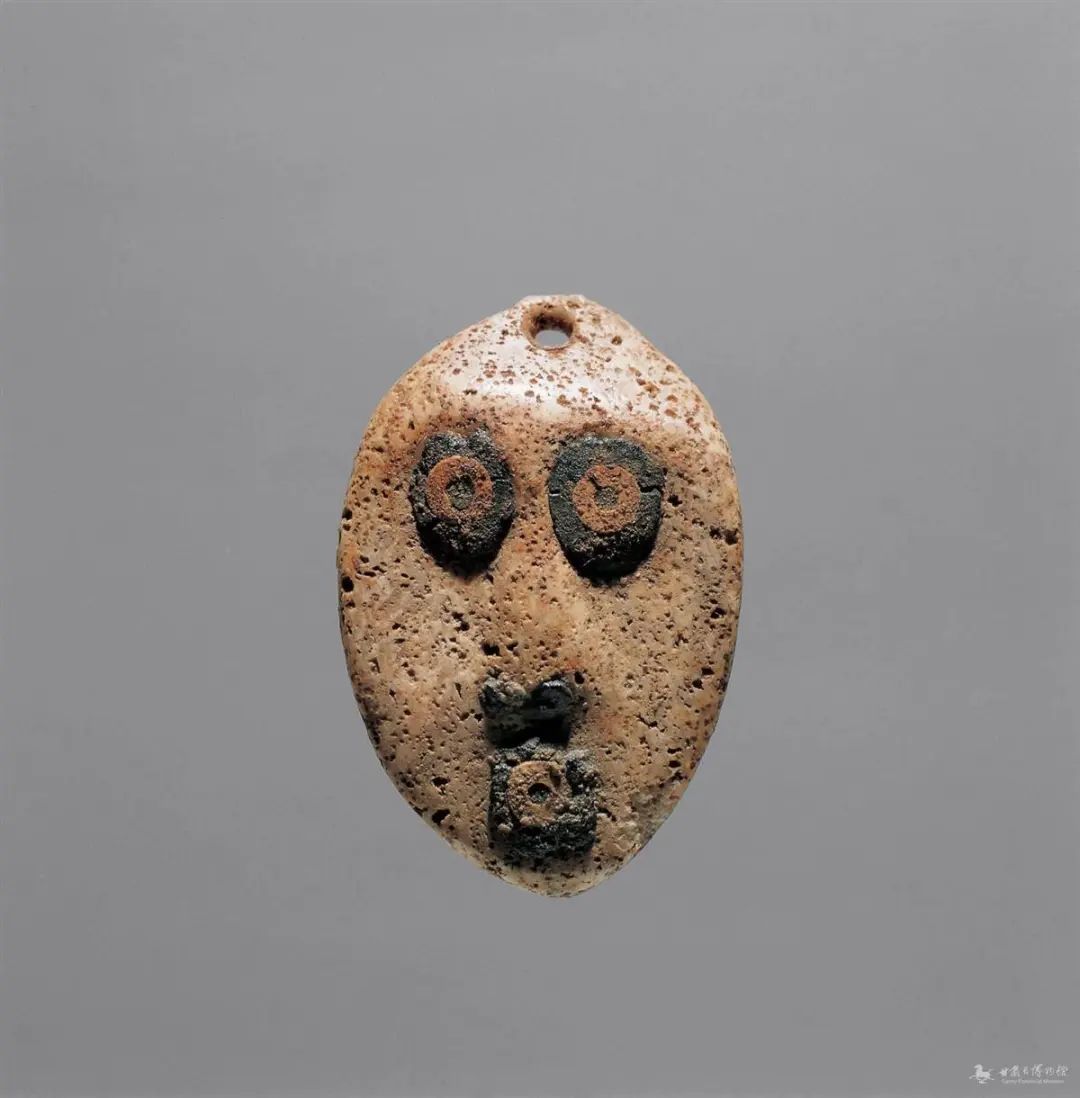 据甘肃省博物馆官方介绍,石雕人面像出土于永昌县鸳鸯池。高3.9厘米,宽2.6厘米,厚0.8厘米。用白色带有褐色斑点的白云石料磨成,呈椭圆形,上部有一穿孔,制法为先刻浅槽,再镶以骨饰,眼圈镶白色骨环,眼睛为黑色骨珠,鼻、口镶大小不同的骨环。